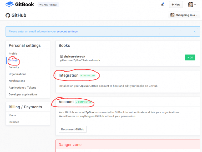 先到Gitbook官网设置setting的Github部分;设置与Github帐号的关联,并添加github的gitbook支持。